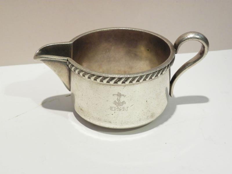 This silver plated jug has the emblem for the United States Navy to one side, it was manufactured by the American company of Reed and Barton, it came to me with a ticked inside which reads ' 1900-1930 United States Navy Reed and Barton wardroom officers mess' and I have no reason to doubt this information. The piece itself is very heavy and solid, sensible on a ship, it comes in good condition with signs of age and use and it measures 5.25 inches long.