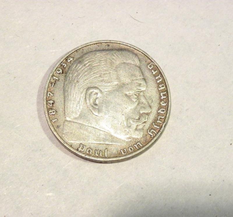 1939 German silver 2 Reichs Mark coin with Paul Von Hindenburg bust and the Hamburg (J) mint mark. Fine circulated condition.