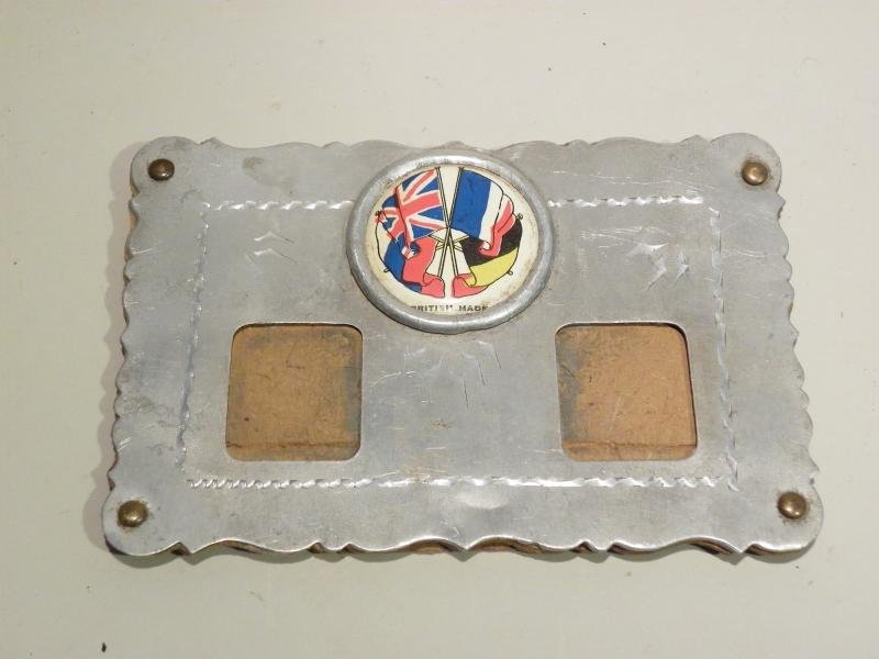 A small double photo frame with engraved aluminium front and a roundel in the centre showing the flags of the allies, Serbia, Great Britain, France and Belgium. A purely patriotic piece in which you could put pictures of your loved ones serving at the front. The frame measures 5 x 3.5 inches.
