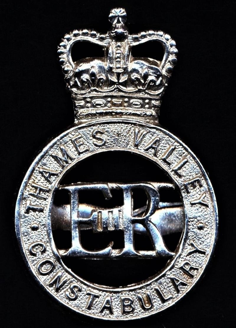 The reverse of the cap badge complete with its 2 x blade fittings as issued Thames Valley Constabulary (later re-styled as Thames Valley Police) was established on 1 April 1968, at which time the hitherto independent police forces of the Royal County of Berkshire, the county of Buckinghamshire, the county of Oxfordshire, the City of Oxford and county borough of Reading Thames Valley Police, were amalgamated to form a new police force. The force is the territorial police force responsible for policing the Thames Valley, covering the counties of Berkshire, Buckinghamshire and Oxfordshire. It the largest non-metropolitan police force in England and Wales, covering 2,218 square miles (5,740 km2) and a population of 2.42 million people Condition: EF