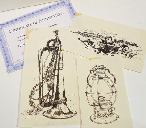 Sold by Sulis fine art in the USA these 3 mid 20th century pen and ink drawings show elements from the American civil war, they include General Grants kerosene lamp, the bugle that blew the cease fire and a canon with dead bodies around, they come with their certificate of authenticity dated 2015, they come in good condition but have been stuck in something with tape on the corners, the largest measures 9.5 inches x 5.