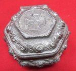 Original era manufacture. White metal or spelter German WWI Iron Cross metal trinket box with yellow silk lining. Small hole in the lid, stands 2.5 inches in height.