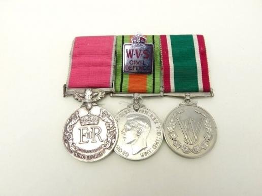 A scarce group of three awarded to Mrs Ann Oliphant for her service in the Women's Voluntary Service during the Second World War and after. The group is comprised of the QEII British Empire Medal, this is named to Ann Mrs Oliphant, the naming looks worn as someone has tried to erase the naming but haven't done a very good job as the naming is still very visible, please see pictures; the WW2 defence medal and the Women's Voluntary Service, Long Service Medal. Women's Voluntary Service for civil defence was established in 1938 by Lady Reading for the enrolment of women for Air Raid Precaution Services of Local Authorities, but after war broke out the service was renowned for any job needed doing, it was done, which included a whole host of war work by the women volunteers. The WVS played a key part in the evacuation of civilians and children from urban areas, collecting clothing required for the needy, known as 'Bundles for Britain', When troops returned to ports after the evacuation at Dunkirk, members of the WVS were there to greet them and hand out food, drink and warm clothing. By the time of the Blitz, women in the WVS were adept at providing food and drink around the clock. While ARP wardens and firemen fought the fires, women in the WVS set up mobile canteens to keep them refreshed, thus placing themselves in serious physical danger with collapsing buildings a constant threat. When the raids ended, the WVS also played a part in looking after those who were injured and had lost their homes. Records indicate that the WVS dealt with and helped over 10,000 people every night of the Blitz, in the streets and at rest Centre's around London; but working so near to the Centre of the bombing inevitably led to casualties, 241 members of the WVS were killed during the Blitz and many more were wounded, 25 WVS offices were destroyed, but these women continued to work on. Needless to say, I have only touched on the work of the WVS and WRVS during and after the war and into the present day. The BEM or its official title 'The Medal of the Order of the British Empire for Meritorious Service' is a hard earned and prestigious order not given lightly, so I am sure this wonderful woman's group will prove to be a great research project, as no research has been done on this lady who served during the war and for a good many years after. All three medals are in excellent condition and mounted on a brooch back bar to be worn. Lastly on her medals still resides her WW2 WVS Civil Defence badge, this is also in very good condition.