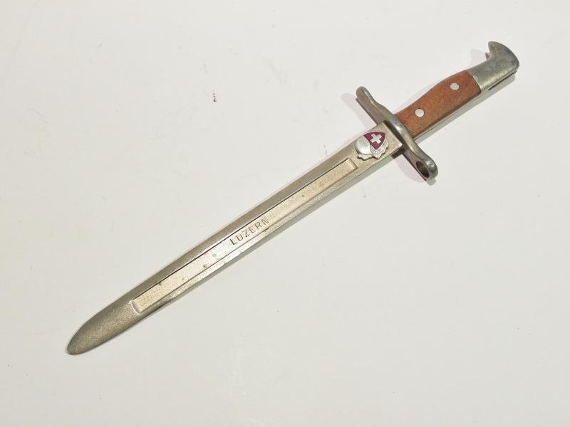 1920's Miniature Swiss 1889 pattern bayonet. The full size bayonet was manufactured from the period of 1889 to about 1917 and they were in service until after WWII. This miniature example has good detail of the full size version and it even has a little working release catch, wood grips and muzzle ring. It has been fitted with a badge showing the Swiss army helmet above the Swiss white cross emblem in a shield below and the blade has been engraved Luzern. A lovely little piece in excellent condition measuring 8 inches long. Shipping to UK mainland only.