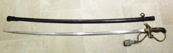 A 1930's – WW2 German army officers sword. By Alcoso, it has a gilt metal hilt with scarcer engraved decoration and an engraved eagle langet to one side and cartouche langet to the other. It has a very good long slightly curved blade with a single fuller to bother sides and the Alcoso makers mark can be found on the ricasso under the Langet. It has a black steel scabbard, which still retains all of its original black finish with some scratches This sword is in excellent original condition, no damage, just a little loss to the gilt finish on the hilt. The blade is clean with some light pitting. It also comes with its original sword knot, the strap is black leather with two lines of metal wire with a red line to the centre. The knot or acorn itself is silver metal bullion with green lines, this also has a green centre. This knot I believe was issued to Reich Municipal Protection Police, but as most officers served as Municipal on Jersey, the knot is in excellent original condition. It measures 41 inches long From the Jersey Collection. Shipping to UK mainland only via courier priced at £14.95