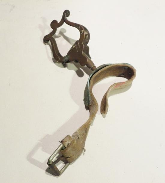 As used by the marching military bands in the brass section, it would strap over the instrument to hold the sheet music, I'm not sure for what instrument but the brass lyre shaped holder is set off centre to accommodate the relevant instrument, there are no maker marks and it comes in used condition, the leather strap which has been white dubbed is well used and the brass needs a clean , hard to measure but roughly 5 inches long.