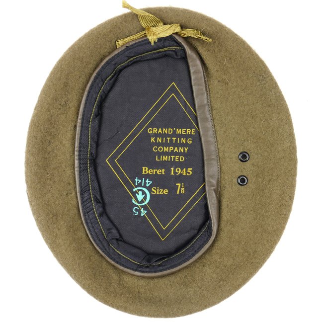 Canadian Khaki Beret. The Canadian Khaki Beret was introduced in 1943. The beret was worn slightly tilted to the left, the insignia had to be worn directly above the left eye. The beret is nicely maker marked by the 'Grand'mere Knitting Company Limited' and dated 1945. The size of the cap is 7⅛. The beret is in unissued condition, there is some minor moth-damage caused by storage. Nice original beret in very good condition.