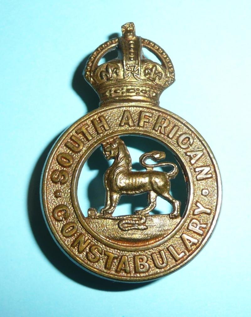 South African Constabulary Edwardian Gilding Metal Helmet and Cap Badge, Voided, Kings Crown