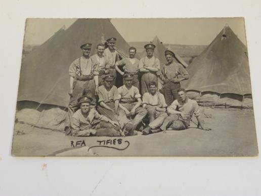 A nice photo postcard showing a group of men from the Royal Field Artillery in front of their tents, it is marked to the front RFA 'Tifies' I have not been able to work out what tifies are perhaps just a slang name for their unit?, the card is marked to the back, France August 30th Cyril'. Comes in very good condition.