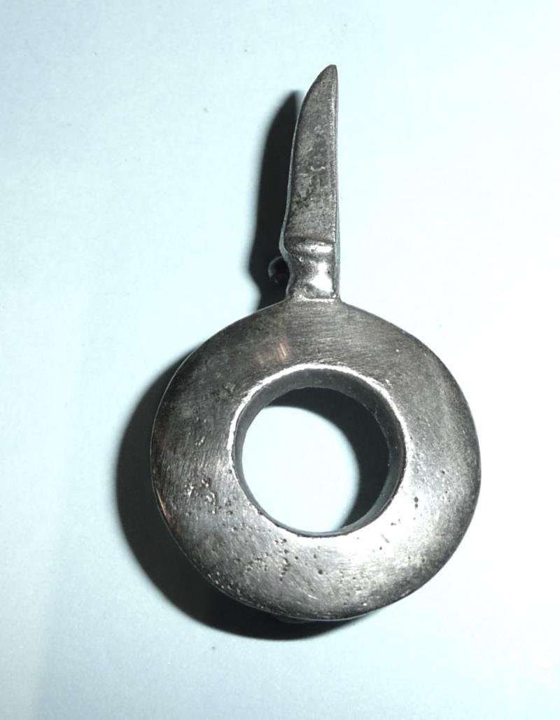 A cast white metal silver plated example with two original loops to the reverse. In good worn condition. Circa 4cms tall. Formed in 1941 and this badge worn post Independence. The regiment's cap badge is a chakram or quoit, with a mounted kirpan. The insignia was designed to honour the Khalsa community's Akali Nihang ancestry. NAM.2013-10-20-55-13. Comm TeMo