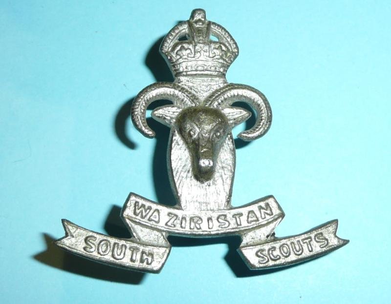 An attractive badge, cast and silver plated with two original loops to the reverse. It depicts the head of an urial ram, a wild sheep of Western Asia with the scroll below bearing the unit title, surmounted by a King's crown. Circa 4.2cms tall. (interestingly, the badge looks like a frog when viewed from the rear!). The South Waziristan Scouts, formerly the South Waziristan Militia, was a paramilitary unit which formed part of British India's Frontier Corps. Other units included the Chitral Scouts, the Gilgit Scouts and the Kurram and Zhob Militias. NAM.2013-1020-56-29 Comm TeMo