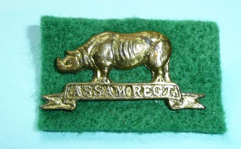 A nicely cast brass cap badge which has been gilded with two original small loops to the reverse, mounted on green felt cloth for display. Slightly smaller the pagri badge listed below. Circa 3.7cms wide. Some service wear but in good condition. The collar badge has the rhinoceros without the scroll. Formed in 1941 from a cadre from the Assam Rifles, the regiment contained a large number of Gurkhas. NAM.2013-10-20-55 - 8 refers. Comm TeMo