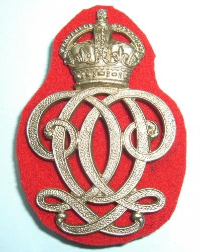 As worn until 1958, this is in white metal with two original loops NS to the reverse (one bent slightly downwards) with scarlet felt backing. The scarlet backing was granted at the request of the Commanding Officer who was perturbed that the Regiment might be mistaken for the Army Catering Corps because both had similar shaped badges. A St Edward's (QEII) crown was never worn by the 7H. Circa 54mm tall and 35mm wide. Linaker & Dine Plate 20.1(A) refers. C23.1
