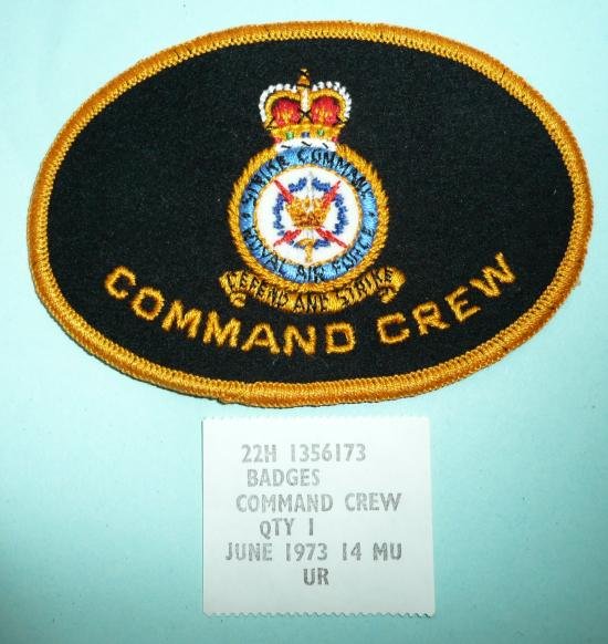 RAF Strike Command badge (QEII crown) above the words - 'Command Crew'. In good condition. The late Professor Charles Thomas speculated this was a probably for some RAF entry into some inter-allied competition. Luckily this one comes with its issue slip and reference number paper which dates it to June 1973 and it was issued by 14 MU (Maintenance Unit) - the logistics set up at RAF Carlisle. Any information welcome. Comm ViCr