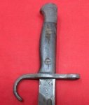 Original era manufacture. We haven't had too many examples of this scarce bayonet in our hands over the years, this is an original, unmodified example retaining it's distinctive hooked guard. Overall very similar in appearance to the early style Japanese Type 30 bayonet. Bright steel blade exhibiting a cleaned appearance and evidence of corrosion pitting along it's length. Clear markings on both sides of the ricasso. Dark steel patina to the hooked guard and pommel with a working lock button. Original finish wooden grips exhibiting wear and chipping to their surfaces. No scabbard.