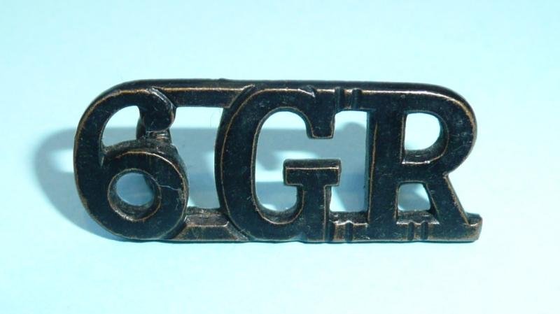 A blackened brass '6GR' shoulder title for the 6th Gurkha Rifles. In good condition complete with original lugs (slight bending). Circa 30mm wide and 12mm tall.Worn by all ranks from 1948 - 1994.Gurkha Museum Publication No 6GR F18 refers.Comm EdBr