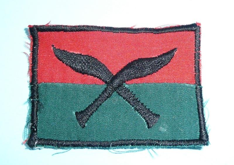 This locally made designation badge flash was worn by only a handful of military staff on the DPM military uniform in Pokhara and on the 'blue uniform' of the Gurkha Civil Guard Staff, the MT staff in Pokhara and at the HQ in Kathmandu. It was adopted in 2004. It was a short-lived issue being replaced by the standard Gurkha Brigade TRF in the following year. Locally made in Kathmandu. Circa 55mm wide and 40mm tall. Some glue and display board green felt from which it has been removed to reverse otherwise in good condition. Scarce. Hodges, Lt-Col (2005) 'British Army Badges', p216. Ser 6 refers. Comm EdBr
