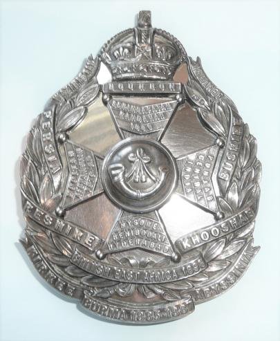 A stunning hallmarked silver full dress belt plate as worn by officers of the 104th Wellesley Rifles from 1903 until 1922. With matching Birmingham Hallmarks with date letter 'f' for 1905 to front and to the reverse of the solid silver backplate and also maker's details 'JRG & S' (JR Gaunt & Sons). Three of three original screw posts to the reverse with their original retaining nuts and washers. . Circa 9.5cm tall. Sharp detail with no polishing. Scarce. A Maltese Cross within a wreath, solid ground, no lions at arms of cross, bugle horn at centre, king's crown above, BOURBON on scroll beneath crown, SERINGAPATAM, KANDAHAR 1880 / MOOLTON, AFGHANISTAN 1879-80 / PUNJAB, CENTRAL INDIA / MYSORE, BENI BOO ALI, HYDERADAB on arms of cross, PERSIA, BUSHIRE, RUSHIRE, KOOSHAB, BRITISH EAST AFRICA 1898 on scrolls on wreath, KIRKEE, BRUMA 1885-1887, ABYSSINIA on scrolls beneath. and identification from the Sir John Chapple catalogue collection listing, page 196. he also states this pattern was also worn by the 123rd Outram's Rifles and 125th Napier's Rifles. Previously recorded examples: h/m 1909 and 1910. Coll