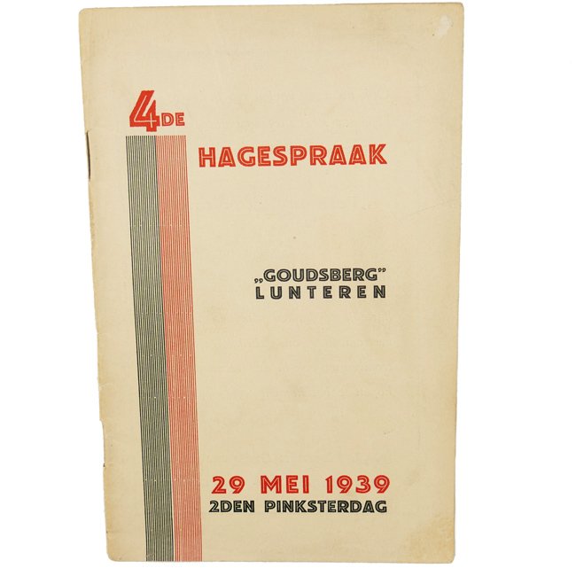 NSB '4de Hagespraak' 1939 Program Booklet. This is a program booklet with information about the 4th NSB Speech held in Lunteren on 29 May 1939. The booklet features 36 pages with many nice black&white advertisements. Rare original booklet in good used condition.