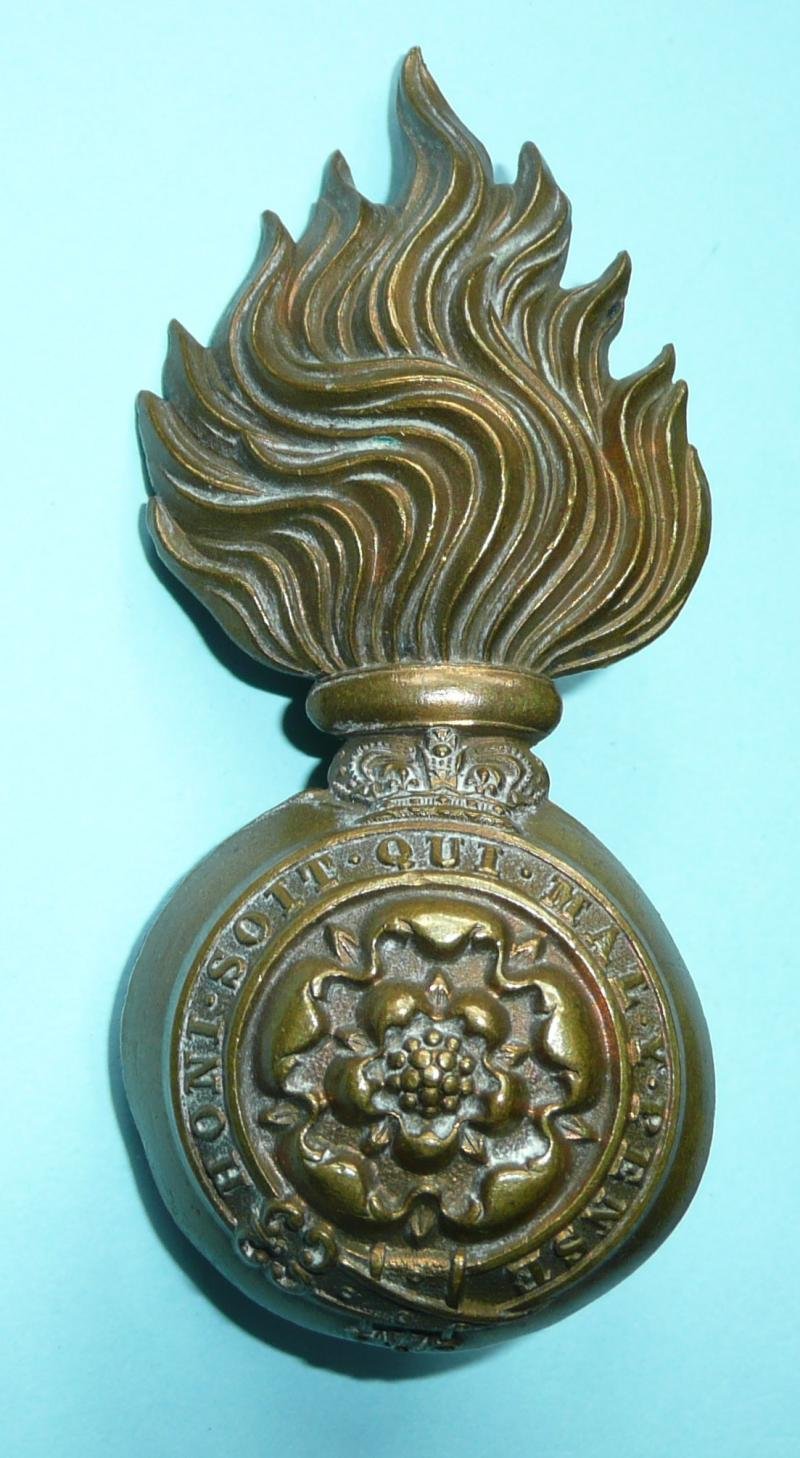 A large brass racoon skin cap badge to the Royal Fusiliers, pre 1902, with two original long loops to the reverse. Circa 9cm tall. A good stiff badge with sharp detail, some service wear to lugs. Note the Victorian crown. K&K Vol 1 No 946 refers. Comm SiSa