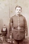 Original era photography. Sepia image of an armed 6th Massachusetts soldier armed with a 45-70 rifle. The man is shown full length, in the position of attention, wearing the regimental dress uniform with his spiked helmet on a photographers table next to him. Good detail throughout, E.E. Howard, Fitchburg Mass photographers logo.