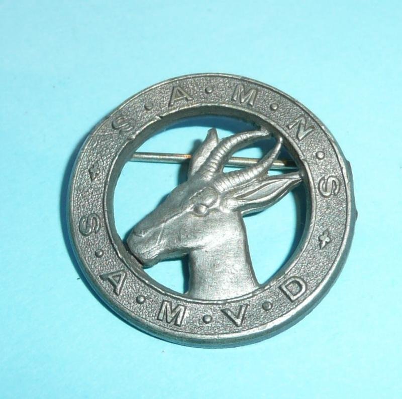 Die struck example with original and functional pin fittings. Circa 28mm in diameter. Minor service wear otherwise in very good condition. Worn circa 1939 - 1962.The design is of a springbok head tracing left within a circle inscribed with the initial letters S.A.M.N.S. (English) and S.A.M.V.D. (Afrikaans). As worn on the coat lapel.Owen No 1600 refers.Comm BoHa (351)