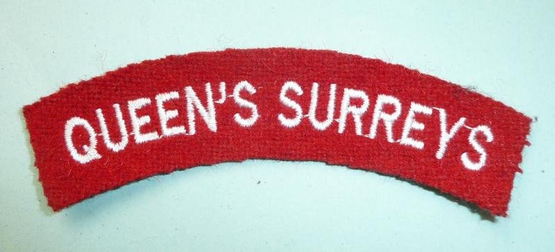 A cloth embroidered shoulder title for the Queen's Royal Surrey Regiment (QUEEN'S SURREYS). Comm LGJR