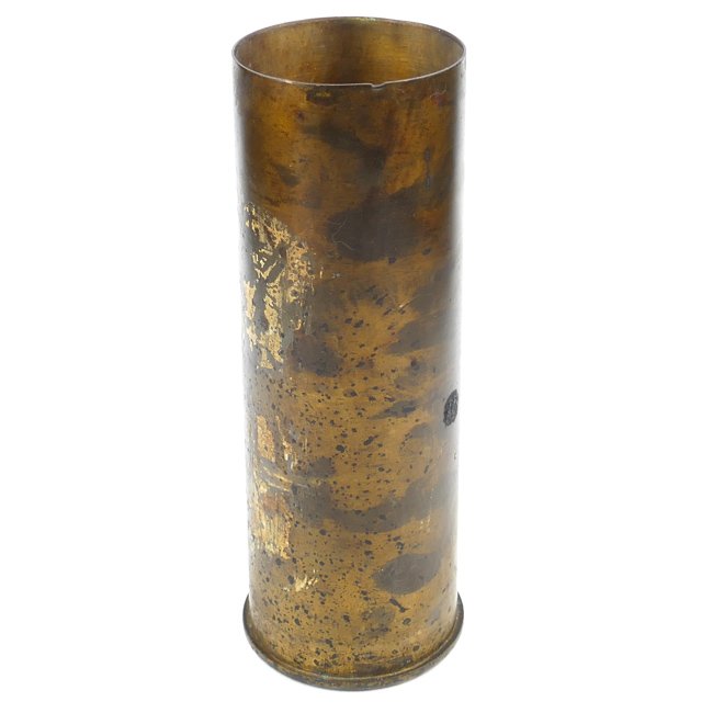 Empty Czechoslovakian 8cm vz.17 Shell Case for the Skoda Light Field Gun. These light field guns were reissue in the German army during World War 2. The empty brass shell case is nicely dated 1935 and showing some ink markings on the bottom. The shell case is showing some staining. Nice original example in good used condition.