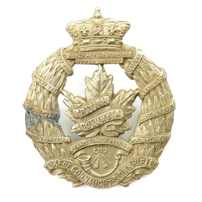 Canadian 'British Columbia Regiment (Duke of Connaught's Own)' Cap Badge. Wartime non-magnetic metal construction cap badge, complete with both lugs. Nice original example in good used condition.