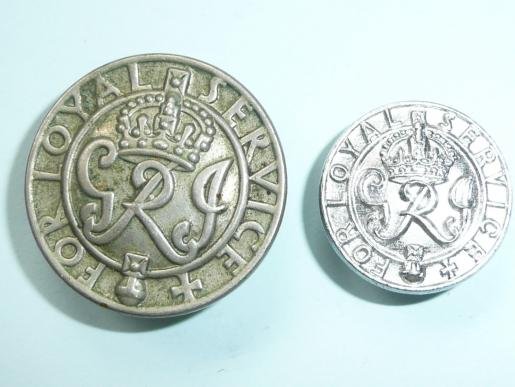 Introduced in 1941, circa 26mm and 18mm in diameter respectively struck in white metal, the smaller one has more of a chrome finish. The King's Badge was awarded to British Forces personnel who had been invalided out of the services during WW2 and were entitled to a war disablement pension. They were both unnamed and unnumbered. In good condition. See items 55610 58299 and 60126, for a single example of the larger of the two.Comm MaFi