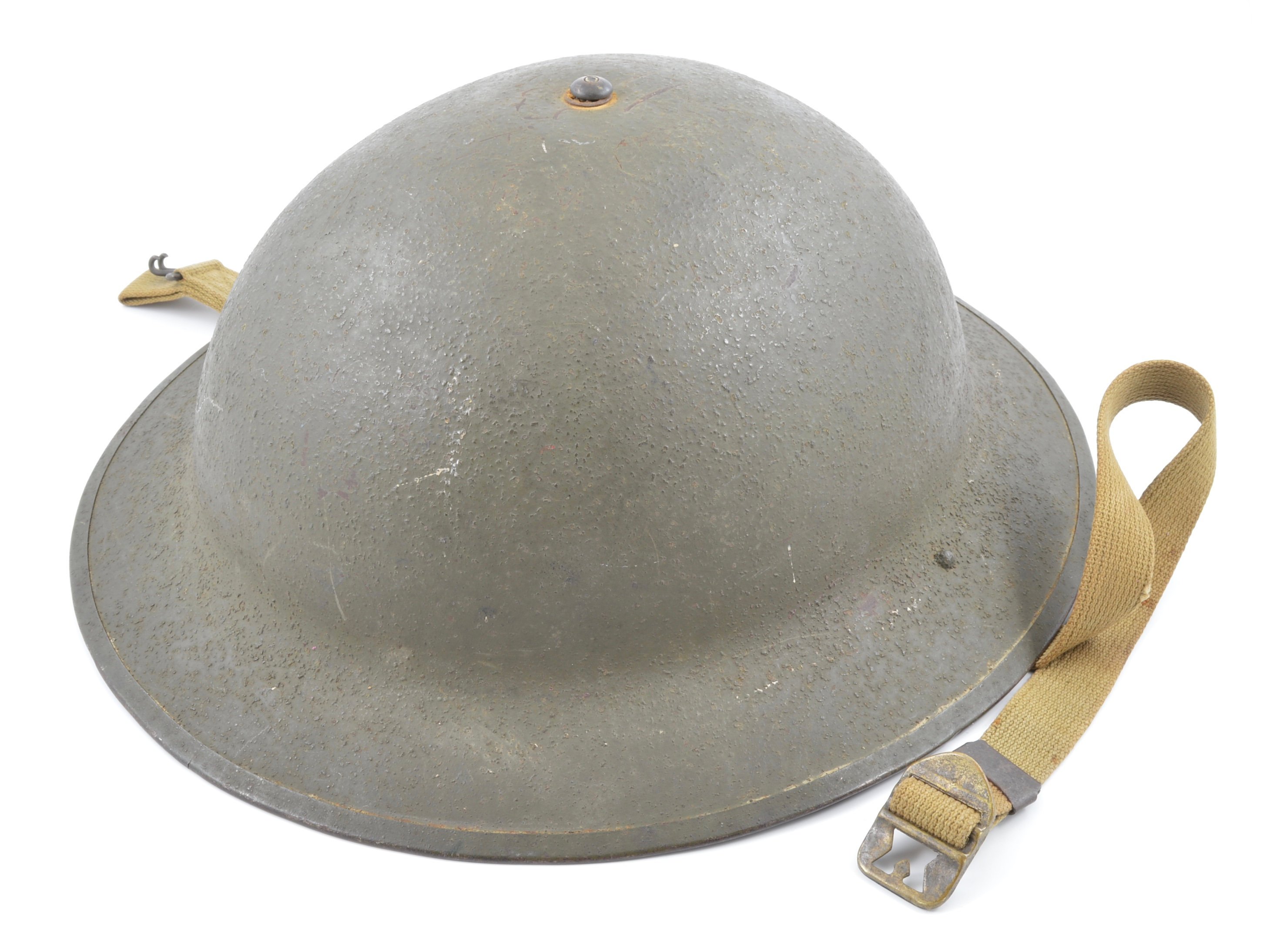 This is an original M1917A1 helmet that was produced by the McCord Radiator & Manufacturing Co. prior to the United States' involvement in the war. On November 27, 1940 McCord received a contract to manufacture the M1917A1 helmet. With an incredibly low heat stamp of 1B, this example is one of the earliest helmets off the assembly line. The helmet's exterior features its original olive drab paint and cork texture. The interior retains its original leather liner and khaki chinstrap. The chinstrap exhibits the early cast-brass buckle and box stitching, while the liner retains its original leather drawstring and crown pad. The leather crown pad is stamped with the U.S. ordnance 'flaming bomb.' The M1917A1 was seen atop the heads of Marines fighting on Wake Island, Bataan, and even during the early days of Guadalcanal. If you've ever wanted an M1917A1, you would be hard-pressed to find a more desirable example.