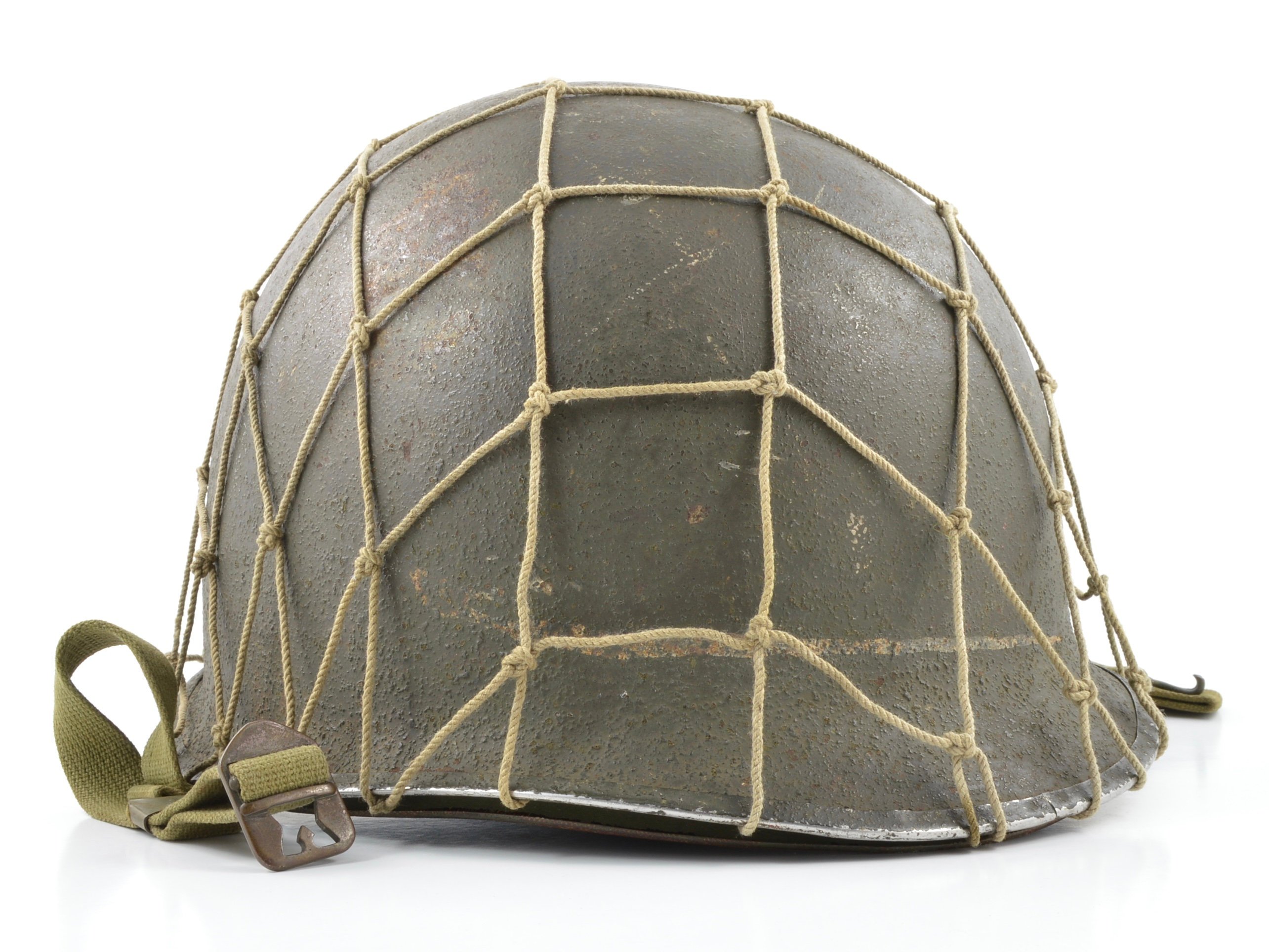 With supply shortages making the M2 'D-bail' unavailable to thousands of paratroopers, this exact configuration saw extensive use before stock could catch up. The McCord manufactured fixed loop M1 helmet shell is in excellent condition. The heat stamp of 575A dates the helmet's production to July 1943. It retains its original factory paint, cork texture, and khaki chinstrap. The chinstrap features a brass buckle in the 'raised bar' variety. The helmet's fixed loops are strong and intact. There are no stress cracks, however the helmet does have some slight indentations at the top. The original WWII U.S. manufactured 2 inch camouflage helmet net adds a unique MTO appearance. The helmet has recently been paired with an original Westinghouse manufactured paratrooper liner. Its factory installed A-yokes have been cut, however remnants are still visible beneath the green painted steel A-washers, which date the liner's production from late-1943 to mid-1944. When paratroopers hit the ground, they often cut their A-yokes to prevent the buckles from bouncing against their cheeks. The wartime photo shows a paratrooper with a similar setup - a netted fixed loop infantry M1 shell, but instead of being paired with a Westinghouse paratrooper liner, it has a St. Clair paratrooper liner (also with missing A-yokes). The liner's khaki suspension is strong and intact. It comes complete with an original Joseph N. Eisendrath Co. manufactured headband and an Am. Stay Co. manufactured neckband. Like the helmet itself, all of the accessories date to 1943. The liner's original olive drab factory finish is in good condition.