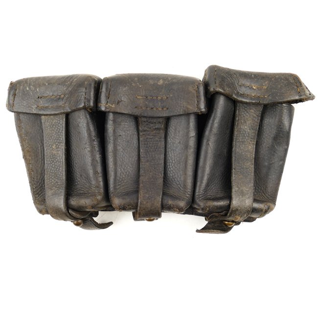 World War 1 German G98/K98 Ammo Pouch (Patronentaschen). The basis design of the ammunition pouches was virtually unchanged since the introduction of this pattern in 1909. The pouch is made of blackened brown leather and having steel parts. The pouch is nicely maker marked by the company 'Aeolus-Werke' from Witzenhausen and dated 1915. The pouch is complete with all partitions. One of the belt-loops on the back has been period repaired. Nice original pouch in good used condition.