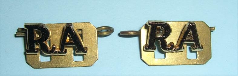 RA ( Royal Artillery ) Matched Anodised Small Pattern Officers Shoulder Titles with Backing Plates and Pins