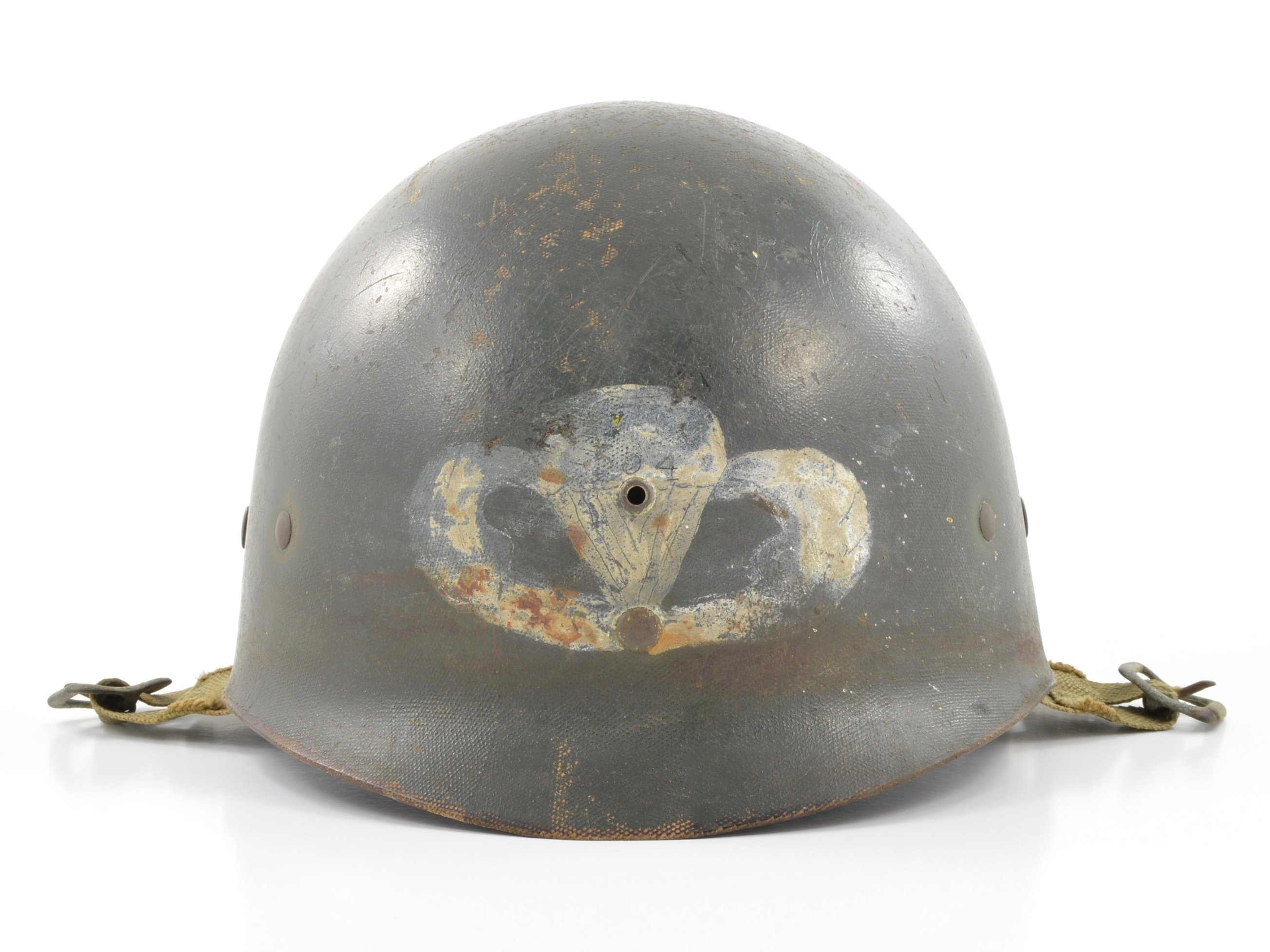 This original U.S. WWII Westinghouse manufactured paratrooper liner would make for an excellent research opportunity. Atop the liner's original olive drab factory finish are hand-painted jump wings and an etched '504', while the back of the liner is named to an apparent 'Ruy, R.' It features original factory installed A-yokes with large cast buckles. The A-washers are blackened brass, which date the liner's production from mid-1944 to 1945. The khaki suspension is torn throughout; it's stamped with the laundry number, 'R-4513', however there do not appear to be any matches in the database, meaning it's possible the original owner was either an officer or his records were lost during the 1973 National Archives fire. It retains its original headband, neckband, and leather liner strap - all of which show heavy use and damage.