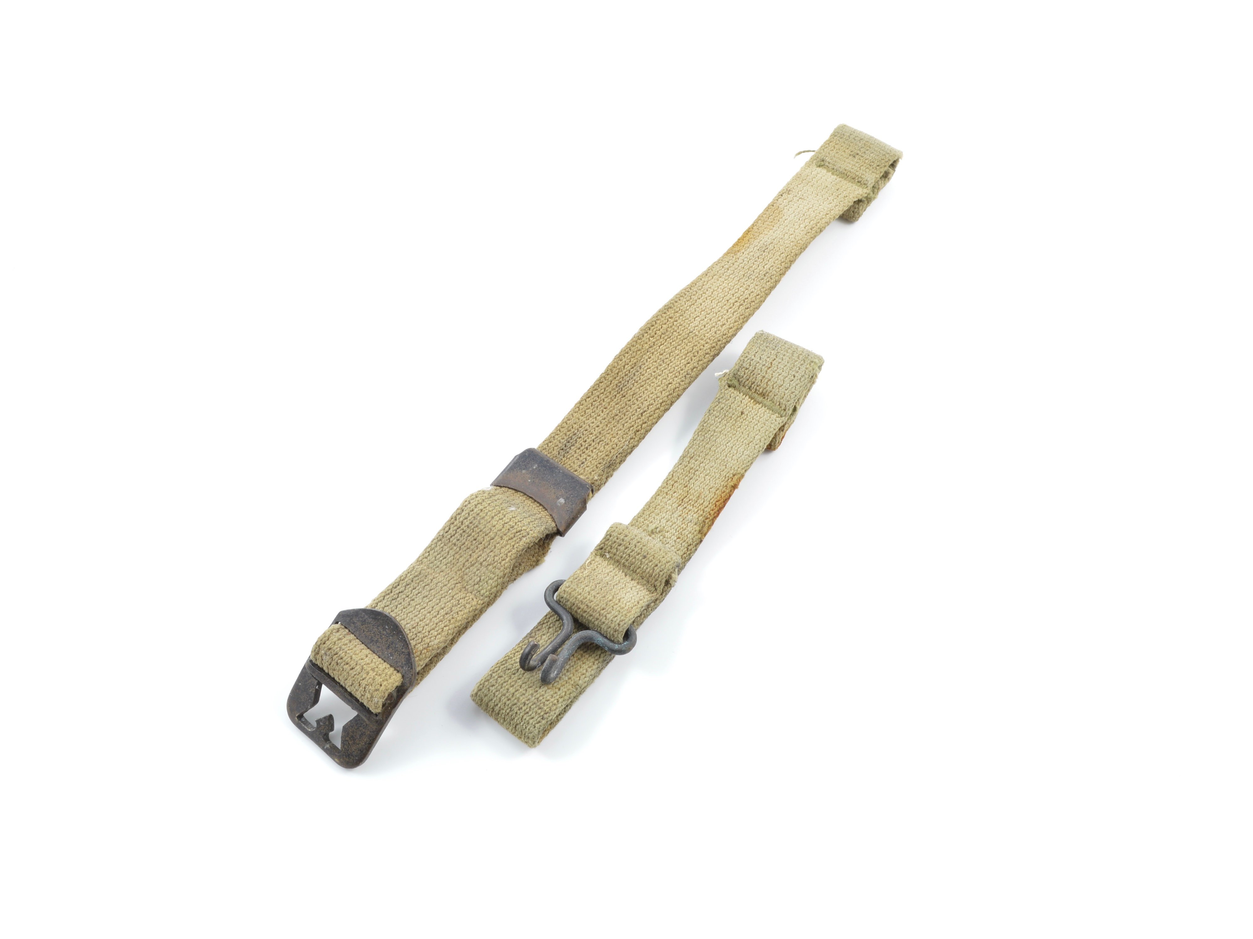 This is an original matching set of U.S. WWII helmet shell chinstraps, consisting of brass hardware and OD#3 (khaki) webbing. They were recovered from an early-war fixed loop McCord manufactured helmet, but would have also been seen on mid-war swivel loop examples. The straps haven't been cut, only their stitching has been undone, meaning these are still their original length.