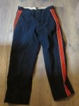 Original era manufacture. Blue wool issue trousers with a 1 1/4 inch red wool stripe, piped in white, on each out seam, extending down from the waistband to the bottom of the cuff. Single, crescent shaped, pocket on the right hip, with an adjustable cloth belt above. White cotton lined waistband and pockets, with an oval shaped issue stamp in red ink, on the left front of the inner waistband, blurred, but the words PHILA.DEPOT can be clearly seen. The cuffs of the trouser legs have been turned up 3.5 inches on each leg, these can be let down if desired. The waistband measures out to about a 34 waist. The trousers are fairly moth free for their age, the largest bit of mothing being two 5mm holes on the rear of the right leg. Full complement of waist and fly buttons, one of which is a period replacement. There is some soiling on the right hip, just below the pocket opening, extending out to the leg stripe, and about a foot down the leg itself. No doubt a careful cleaning can help with this.