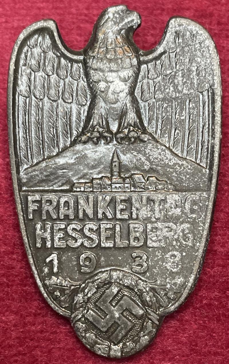 In a good but used condition a NSDAP Franken day Hesselberg 1938 badge. Frontside: A large eagle sitting on top of the Hesselberg. townview in front. Frankentag Hesselberg 1938. Swastika inside a oakleave wreath. Backside: Safety pin. Maker marked C. Balmberger from Nürnberg