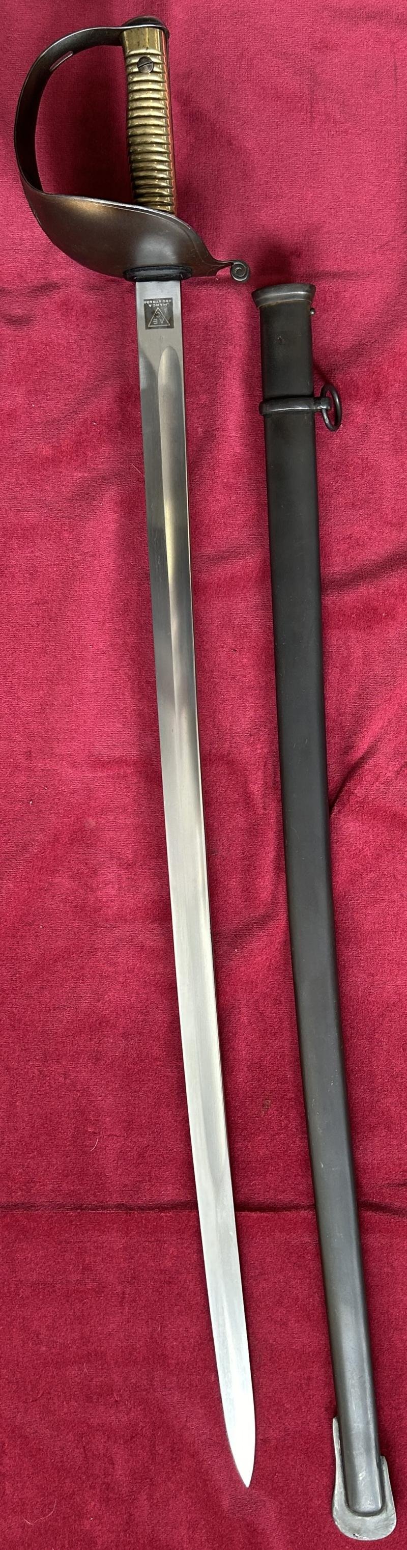 In an almost mint condition a 1889 pattern Brasilian navy sword The sword has an excellent blackened sword guard and scabbard. Marked AEC inside a triangle Marca Registrada on the ricasso and marked with an anchor on the grip. Grips made of brass. One screw missing on the scabbard mouth, but nothing concerning to the sword. The blade is excellent condition. Marked on the guard the crest of the 1st Brasilian republic which existed between 1889-1968 Total length 100 cm.