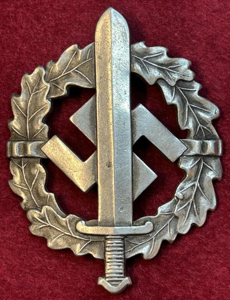 In an excellent condition a silver SA sport badge 1st model (Christian Lauer) Backside: safety pin. Maker markedBonner Kunstabzeichen Bedarf (Bonner Art badge supplies) from Bonn an der Rhein and Eigentum der Chefs der Ausbildungswesens. It also has a very low inventory number 21190. The SA Sportabeichen were awarded to those who had successfully passed an educational and physical program set out by the Sturmabteilung from the NSDAP.