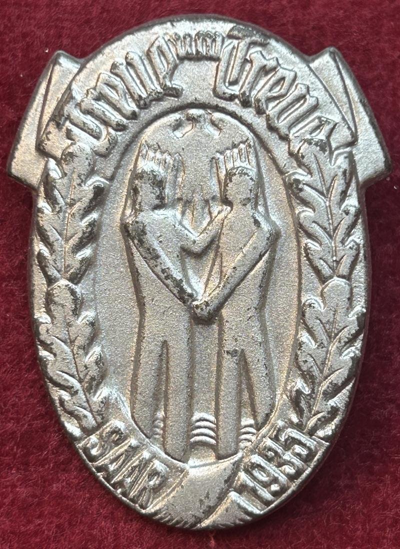 In a very good condition a patriotic badge for the Saarabstimmung in January 1935 The Saarbeckengebiet was controlled by the English and French from 1920 -1935 for the League of Nations. When the people were asked to make a choice between incorporation in France or Germany the NSDAP would try to influence the votes amongst initimidation but also with patriotic badges like this badge.