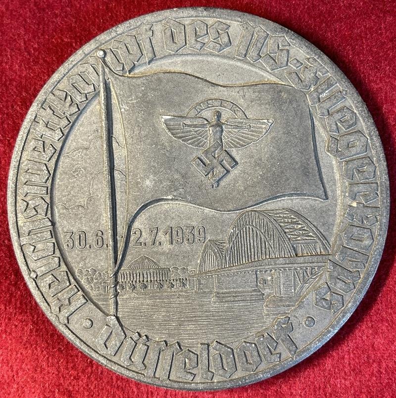 In a very good condition a NSFK Plaque Reichs competition of the NS flying corp Düsseldorf Frontside: Reichswettkampf des Nationalsozialistisches Fliegerkorps Düsseldorf 30.6.-2.7.1939. NSFK emblem in the middle on a large flag. With some landmarks of Düsseldorf Backside: NSFK men running with full gear and above a glider flying above the clouds. The plaque is made from zinc and lost most of its silvering. The zinc it self is in excellent condition.