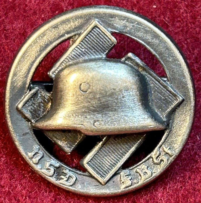 In an excellent condition a NSD Stalhlhelm membershipspin. Frontside: Stahlhelm in front of a Swastika on a circle. n.s.d. F.b.St. (Nationalsozialistischer Deutscher Frontkämpferbund Stahlhelm) Backside: Marked ges. Gesch. Maker marked E.V.