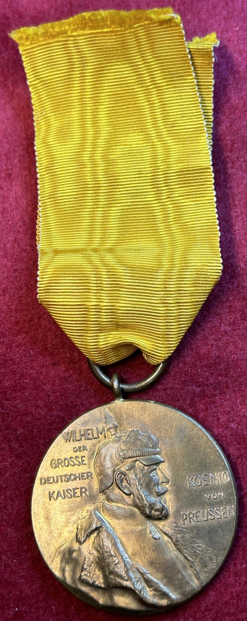In an excellent condition a comemorative medal for Emperor Wilhelm I. The 'Zentenarmedaille', also known as 'Kaiser Wilhelm I. Erinnerungsmedaille 1897', was established by his grandson, Wilhelm II, on March 22, 1897, on the occasion of the 100th birthday of Wilhelm I. The bronze medal had a diameter of 40 mm and hung from a 36 mm wide ribbon. The obverse showed Wilhelm I in a military uniform with the inscription WILHELM / DER / GROSSE / DEUTSCHE / KAISER on the left and the inscription KOENIG / VON / PREUSSEN on the right. The reverse shows the royal objects including the state crown, king's orb, sword and sceptre, displayed on a cushion surrounded by oak foliage. On the left a laurel branch is shown next to the text ZUM ANDENKEN AN DEN HUNDERTSTEN GEBURTSTAG DES GROSSEN KAISERS WILHELM I. 1797 22.MAERZ 1897