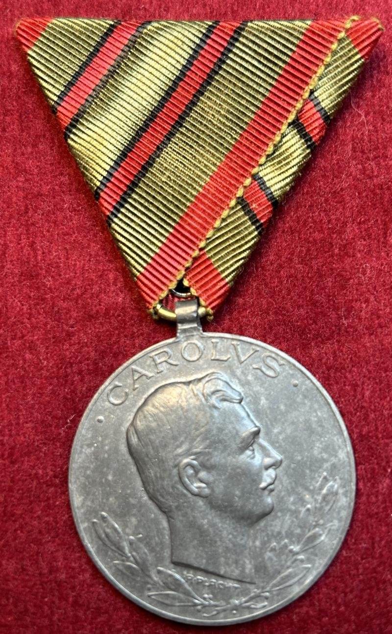 In an excellent condition a Austria-Hungary wound medal (2 stripes) The ribbon shows how many battle wounds have been taken, in this case 2 stripes means 2 wounds. The medal was established on August 12, 1917, by Emperor Karl and was the last medal to be officially founded in the empire. The Wound Medal was awarded to service members of the Austro-Hungarian armed forces and to persons attached to the Austro-Hungarian armed forces who were wounded as a result of combat operations. Besides wounded persons, it was also awarded to persons who were disabled or suffered serious damage to their health in connection with military actions. The medal was made of zinc, and measured 38-mm in diameter. The zinc surface was dull gray, but examples with a polished surface often appear. The obverse of the medal featured a bust of Emperor Karl with his name in Latin 'CAROLUS' above and a wreath of laurels below. Between the bust and the laurels in smaller letters was the name of the designer of the medal, R.(Richard) PLACHT, 1880 Kratzau - 1962 Vienna. The reverse featured the words LAESO MILITI ('to the wounded soldier') and the date in Roman numerals 'MCMXVIII' (1918). The medal was suspended from a typical Austrian-style trifold ribbon, 39-mm in width. The ribbon was gray-green with 4-mm wide red edge stripes. The number of wounds was indicated by narrower 2-mm wide red stripes, edged in black, centered on the ribbon. No stripes indicated an award for someone invalided out of service. One stripe indicated a single wound, two stripes two wounds, etc.