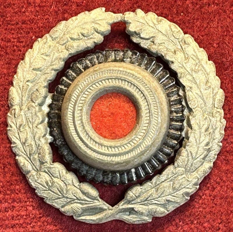 In a very good condition a Reichspost/ Postschutz oak leaf wreath and cockade for the visor cap Splints missing, made from zinc.