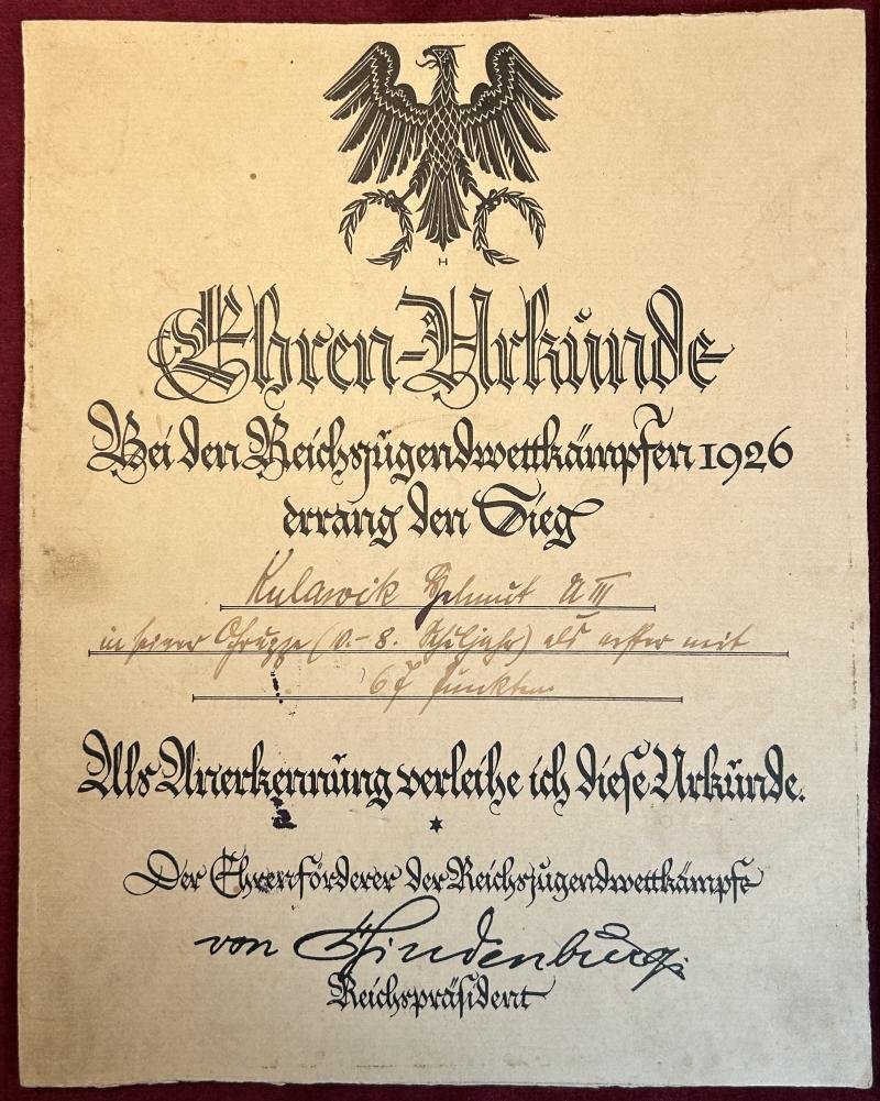 In an excellent condition an honor award document for the Reichs Infantry competitions 1926 Signed by Reichspresident Hindenburg