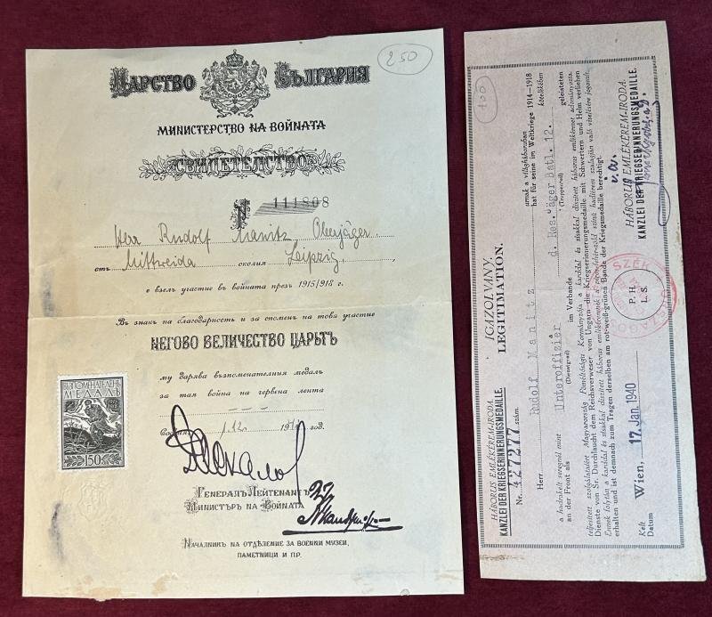 In an excellent condition an Oberjäger award dcouments for the Bulgarian and Hungarian WWI medals The Oberjäger (Rank Unteroffizier) Rudolf Manitz of the 1. Königlich Sächsisches Jäger-Bataillon Nr. 12 received the Bulgarian and the Hungarian remembrance medals for the 1st WW with these two award documents. They are both signed during WWII
