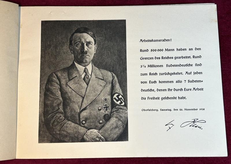 In an excellent condition a remembrance book for the building of the Westwall The book starts with Arbeitete 1938, im Jahre des Anschlusses der Ostmark und der Befreiung der Sudetendeutschen, für die Sicherung der Deutschen Grenzen. The name of the owner has been striked-through. The book is written by the Generalinspektor für das deutsche Straßenwesen. More photos are available Published by Bruckmann from Wiesbaden, 1938
