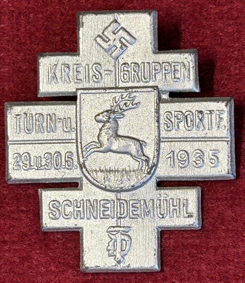 In an excellent condition a Deutsche Turnerschaft Gymnastiscs and sport festival Schneidemühl 1935 Frontside: Turnerkreuz shaped medal. Kreis-Gruppen Turn- und Sportfest 29. und 30.6.1935 Schneidemühl. Swastika above and DT emblem below. Crest in the middle of Schneidemühl. Backside: Safety pin.